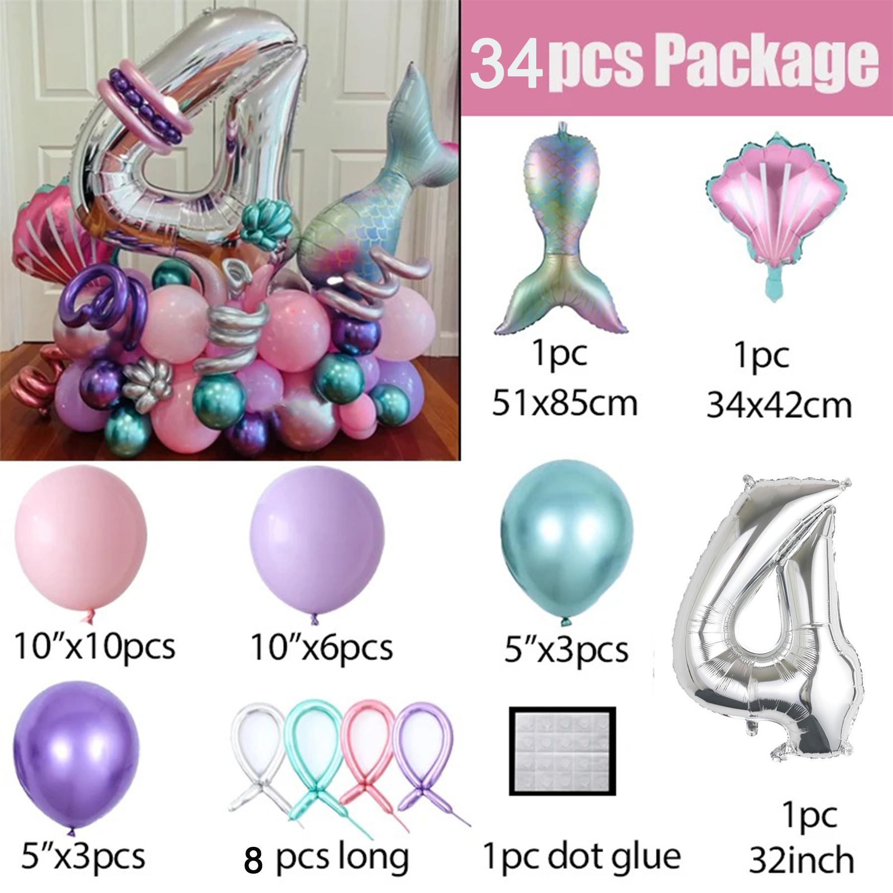 34 шт. воздушные шары с хвостом русалки, розовый, фиолетовый, воздушный шар из фольги с номером, детские украшения для дня рождения, вечерние шары с русалочкой