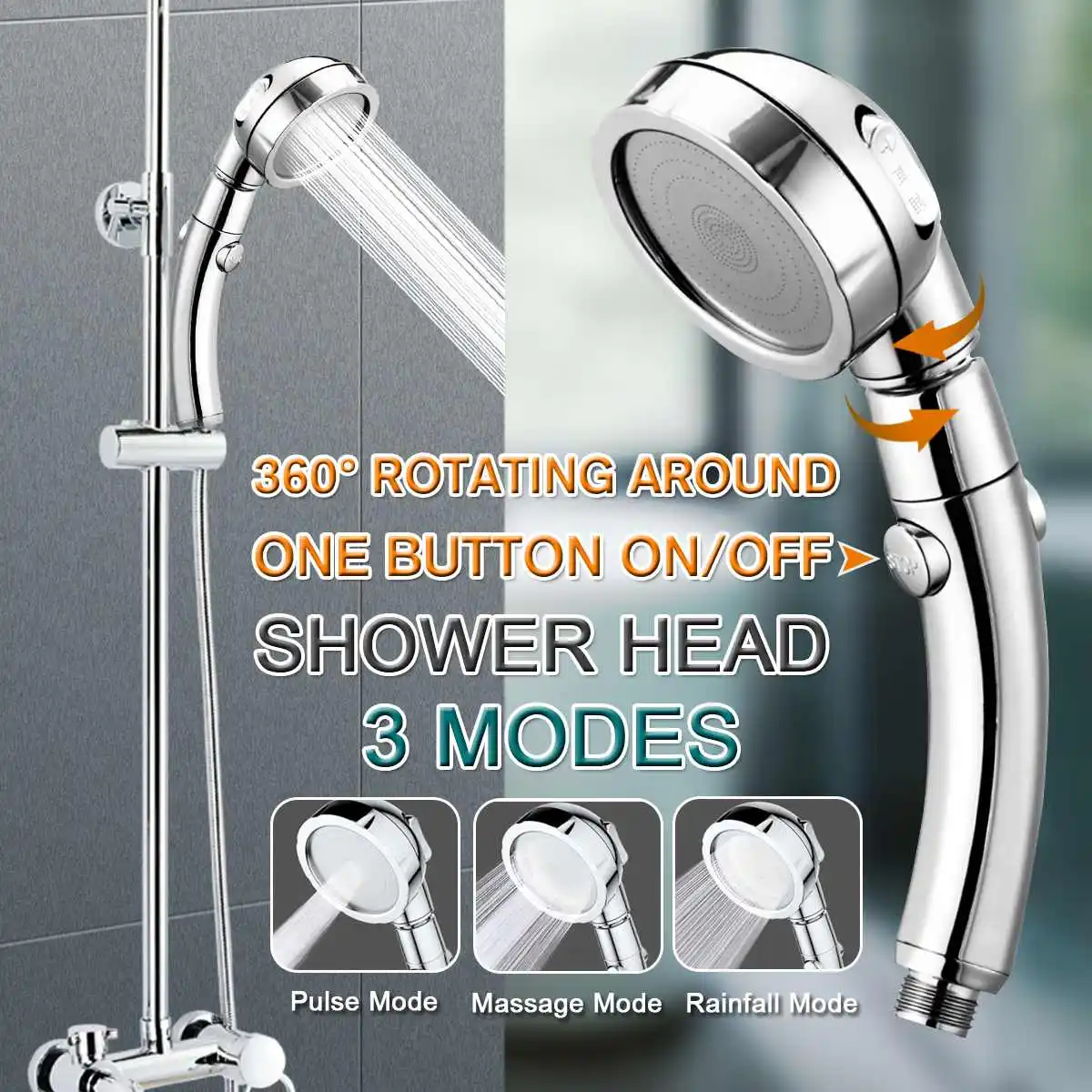 360 Degrees Rotating Adjustable Water Saving Shower Head 3Mode Shower Water Pressure With Water Control Button bathroom