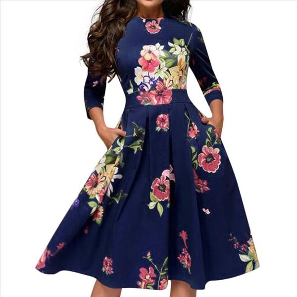 38 осень повседневная цветочное платье женщины плюс размер 3xl элегантная линия винтаж винтаж печать цветочные ожеленные ожеленые платье ves, Black;gray