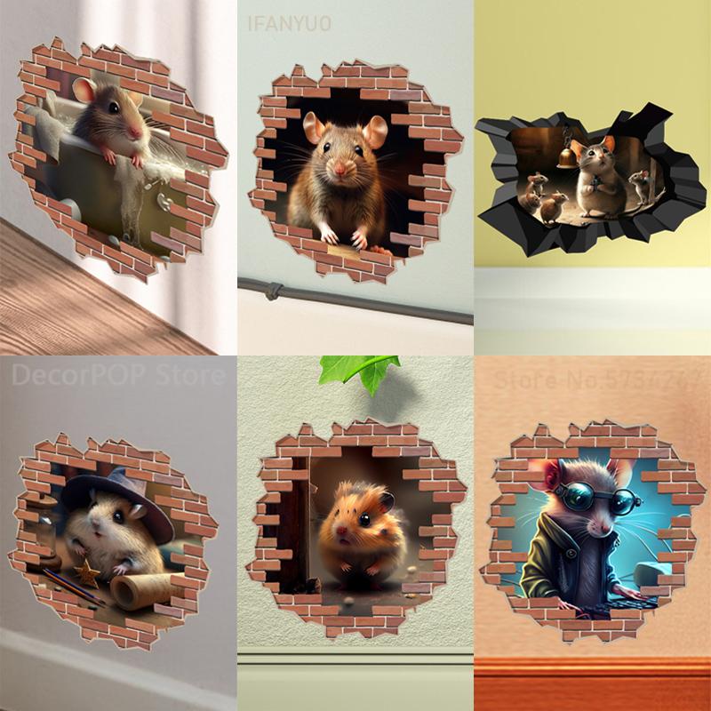 3D Сломанная стена Мышиная нора Наклейки на стену Смешная мышь Читающая Работающая Купающаяся мышь в норе Виниловые угловые наклейки для лестницы Домашний декор
