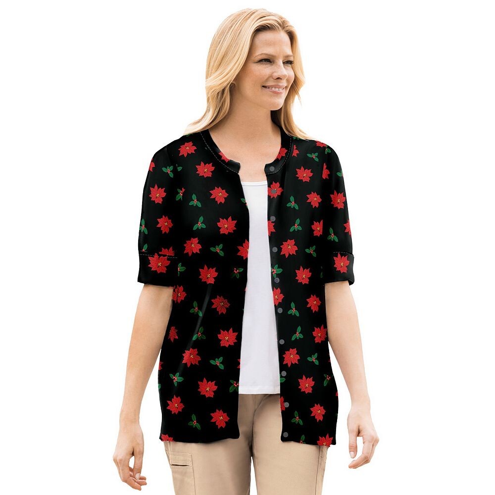Женщина в женском идеальном кардигане с рукавами до локтя больших размеров Woman Within, цвет Black Poinsettia
