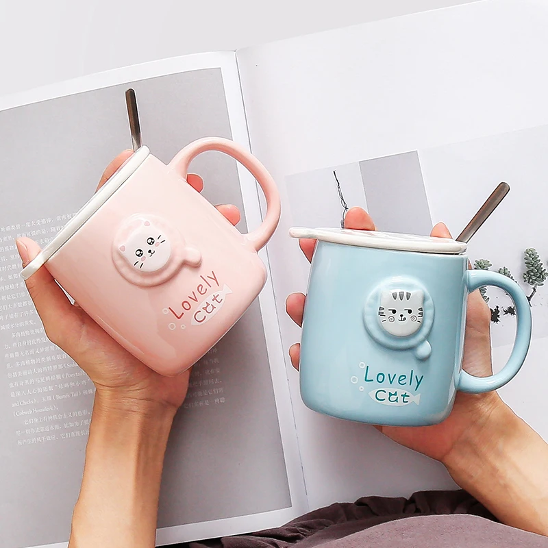 3D рельефная мультяшная керамическая кружка с котом, с крышкой, ложкой, кофейные кружки, красивые чайные кружки, посуда для напитков, чашка дл...