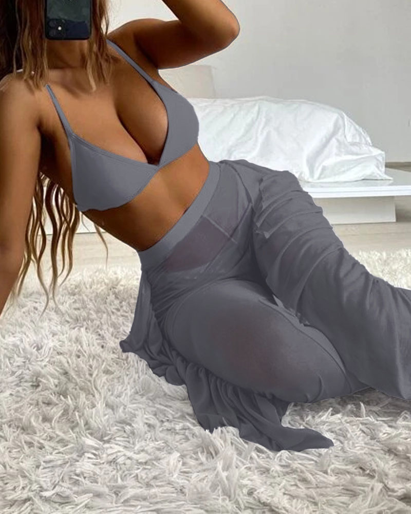 3PCS Bikini Set With Ruffle Hem Sheer Mesh Cover Up, Gray