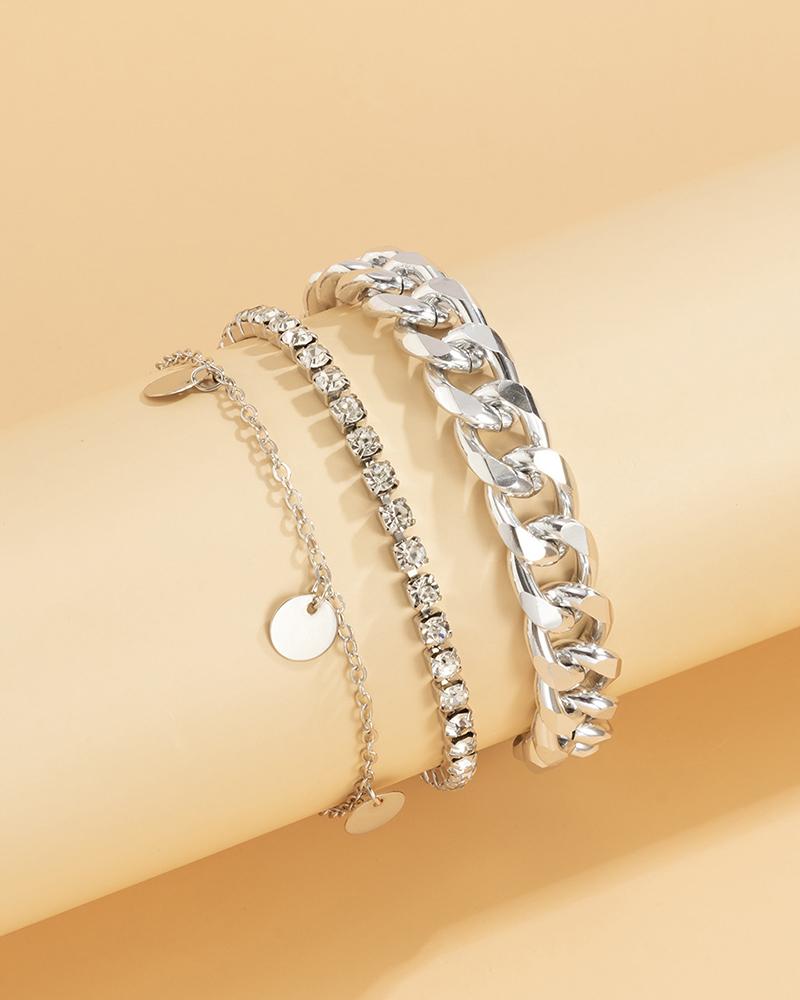 3PCS Cuban Link Chain & Rhinestone & Disc Anklet Set, Silver