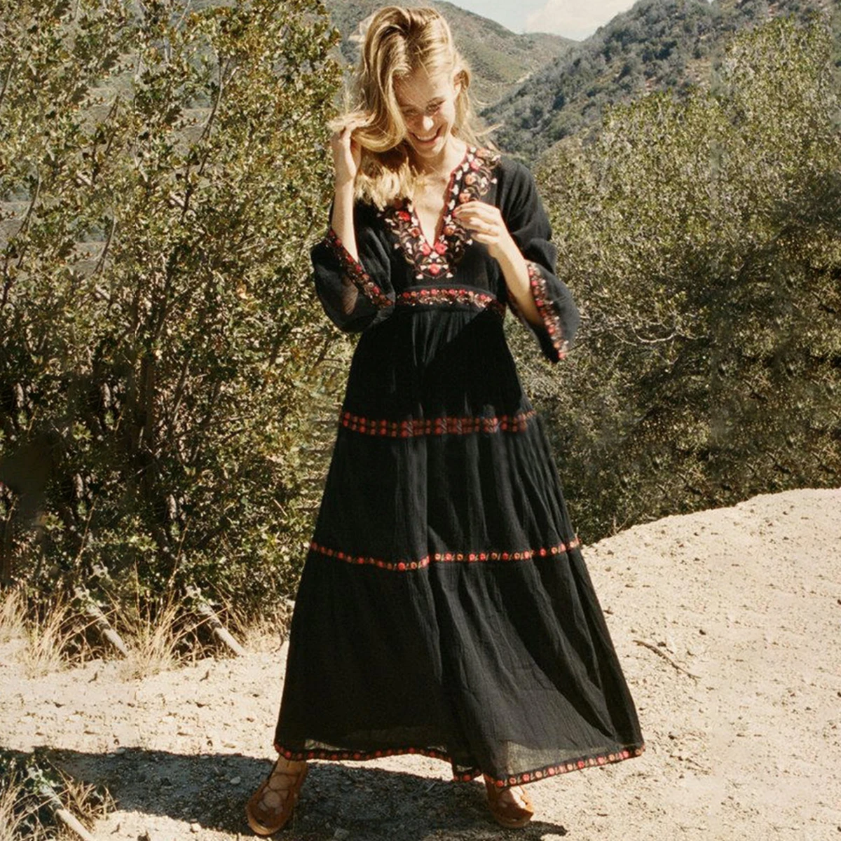 Embroidery Elastic Waist Maxi Dress Women Vintage Deep V-neck Boho Cotton Dress Autumn Vacation Large Hem Vestidos Femme Robe