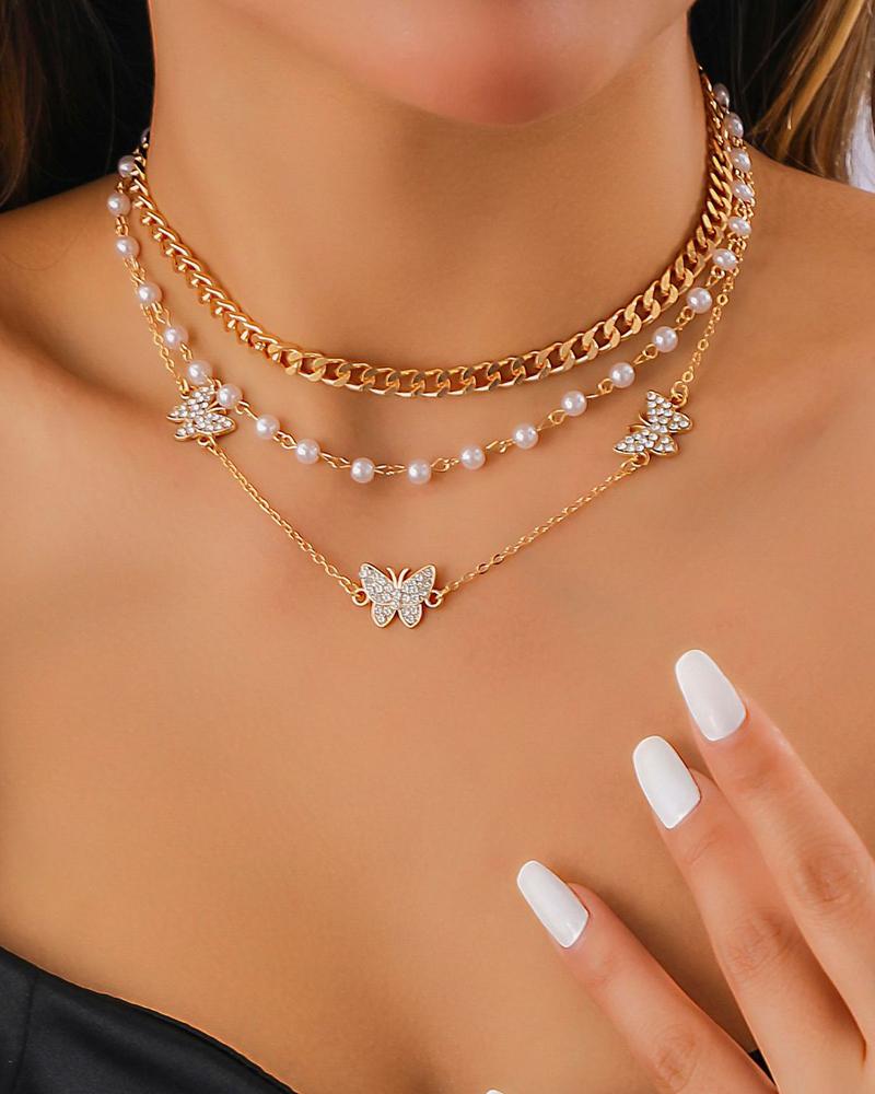 3pcs Butterfly Pattern Beaded Chain Necklace Set, Gold