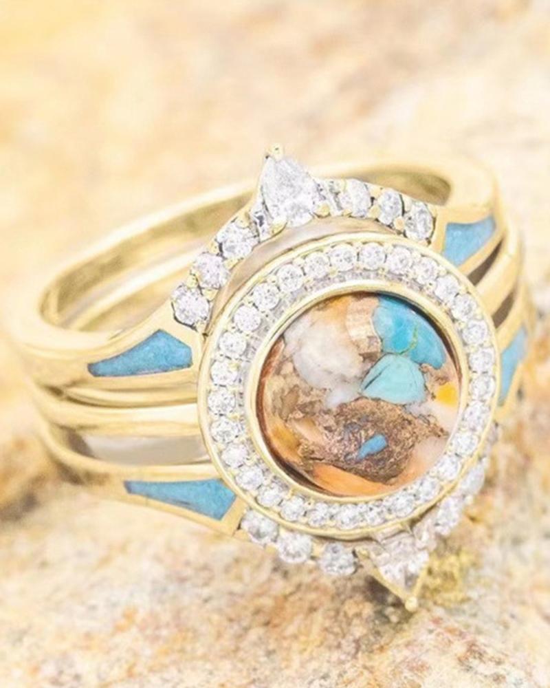 3pcs Rhinestone Decor Turquoise Matching Rings Set, Gold