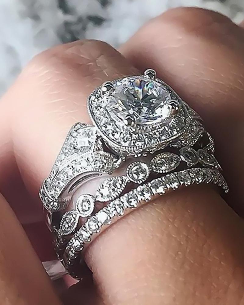 3pcs Square Shaped Rhinestone Decor Ring Set, Silver