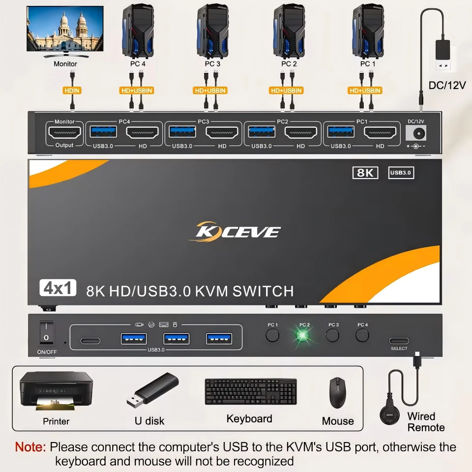 4-портовый KVM-переключатель HDMI, 4 компьютера, KCEVE 8K при 60 Гц/4K при 144 Гц USB 3.0 KVM-переключатель EDID-эмулятор для 4 ПК, 1 монитор, 4 порта USB