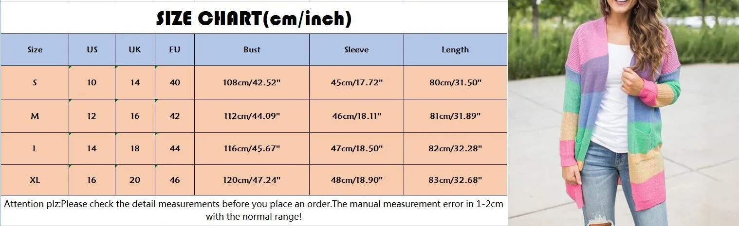 2021 Autumn Winter Women Coat Cardigan Warm Knitted Sweater Patchwork Long Sleeve Plus Size Rainbow Stripe Cardigan Tops Coat