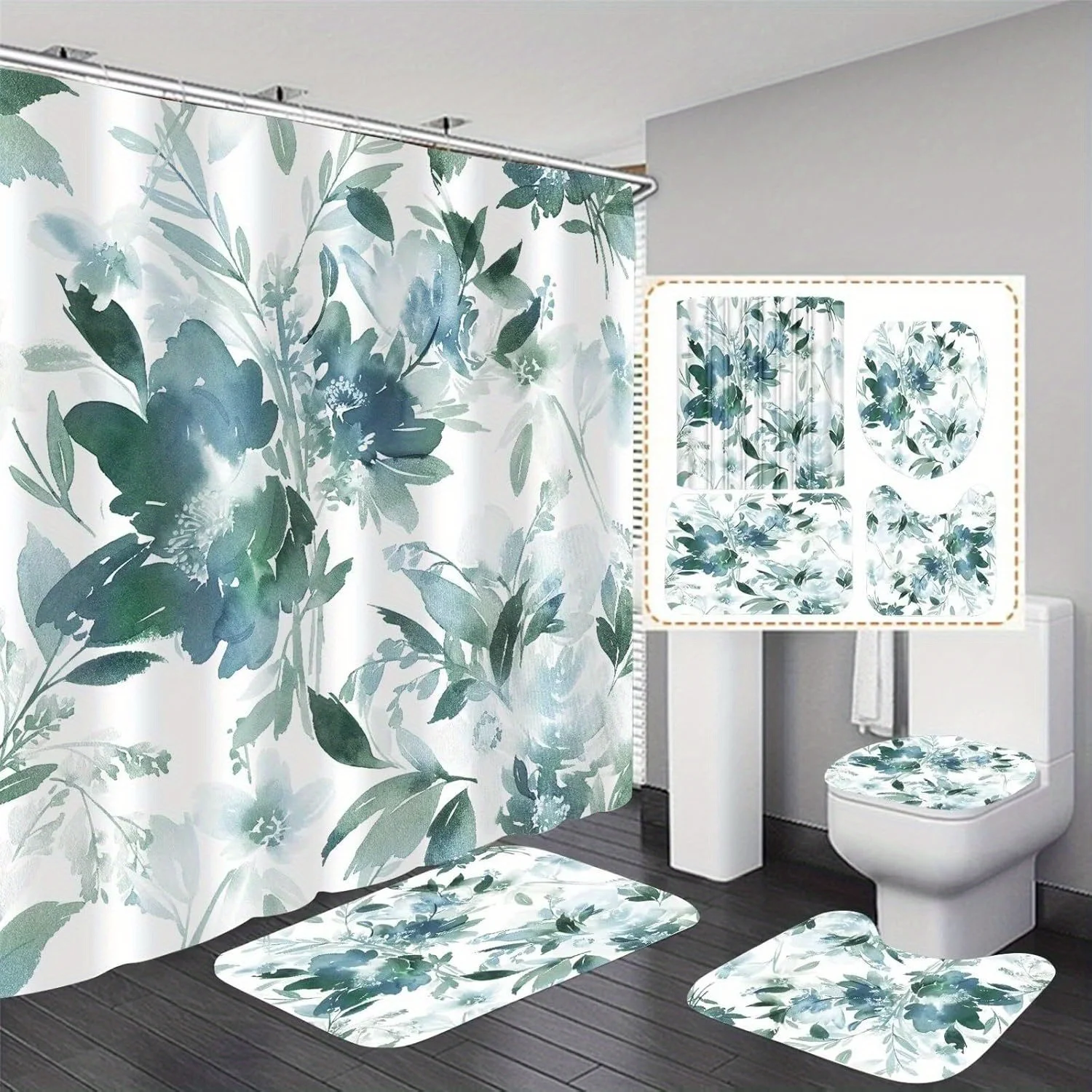 4 шт. декор для ванной комнаты с узором зеленого листа, можно стирать в машине, полиэфирная ткань, занавеска для душа, коврик для унитаза, нескользящий коврик U-образный коврик