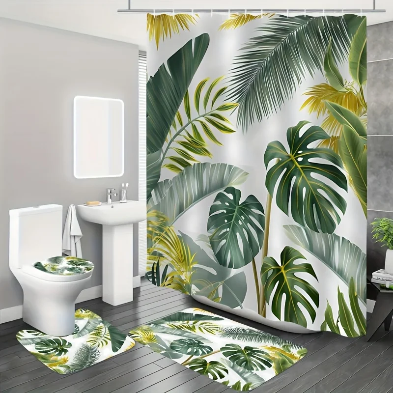4 шт., зеленый пальмовый лист, прозрачный декор для ванной комнаты, полиэфирная ткань, можно стирать в машине, занавеска для душа, коврик для унитаза, нескользящий U-образный коврик
