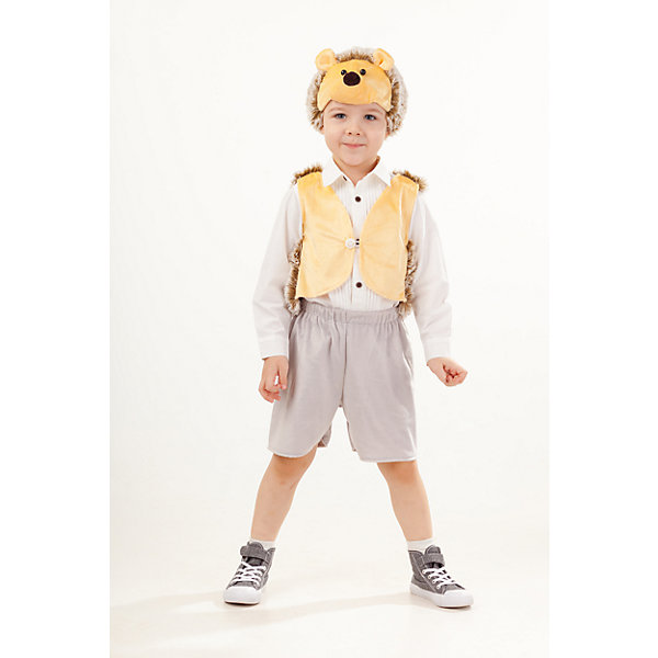 Верх 100% полиэстер; подклад: 35% хлопок+65%полиэстер Оригинальный карнавальный костюм Ежик Степка в серо-бежевых тонах. Жилетка в интересном исполнении, на спинке длиноворсовый плюш коричневого цвета иммитируют колючки ежика, шорты серого цвета на резинке . Маска-шапка с иммитацией иголок, в виде мордочки ежика с объемными носом и ушками .