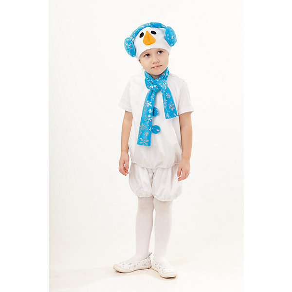 Верх 100% полиэстер; подклад: 35% хлопок+65%полиэстер Милый карнавальный костюм для мальчиков Снеговик Крош выполнен из мягкого плюша белоснежного цвета. В комплект входит безрукавка с шарфиком, шорты на резинке. Завершает образ Снеговичка маска-шапка с набивным носом-морковкой и объемными наушниками.