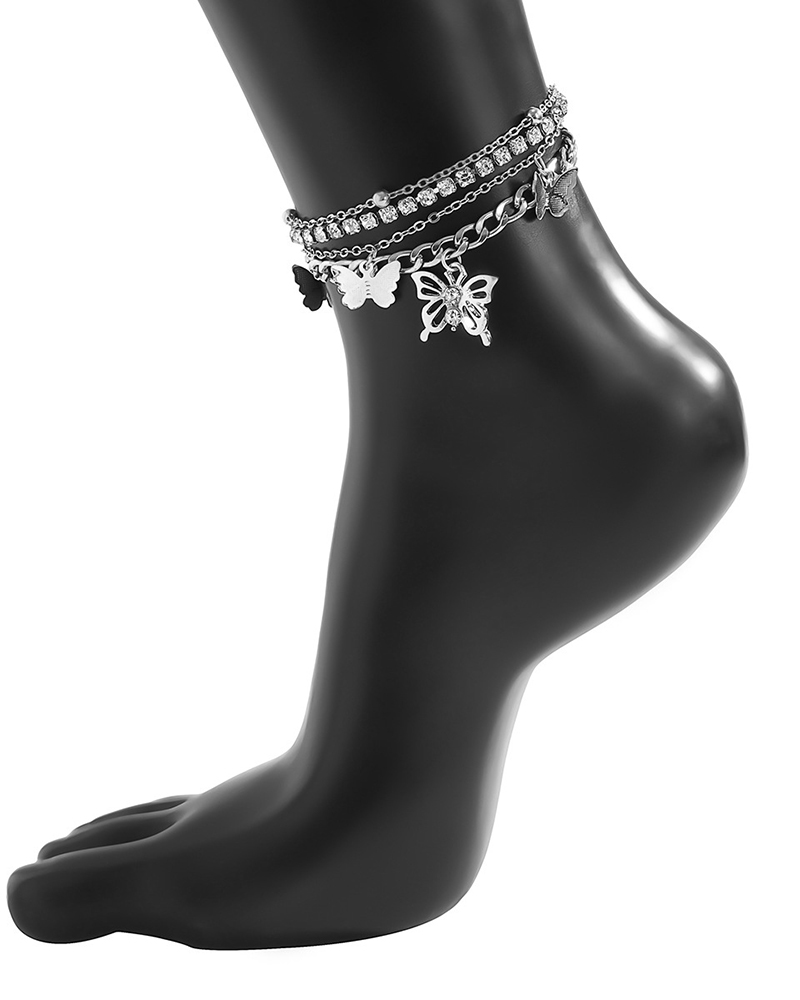 4PC Butterfly Pattern Rhinestone Anklet, Silver