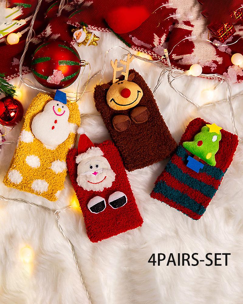 4Pairs Christmas Tree Santa Snowman Elk Pattern Fuzzy Thermal Socks Set, Red