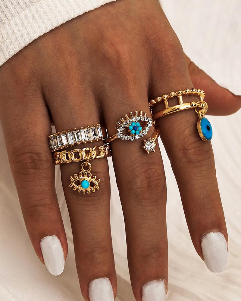 4pcs Punk Rhinestone Evil Eye Pattern Ring Set, Gold