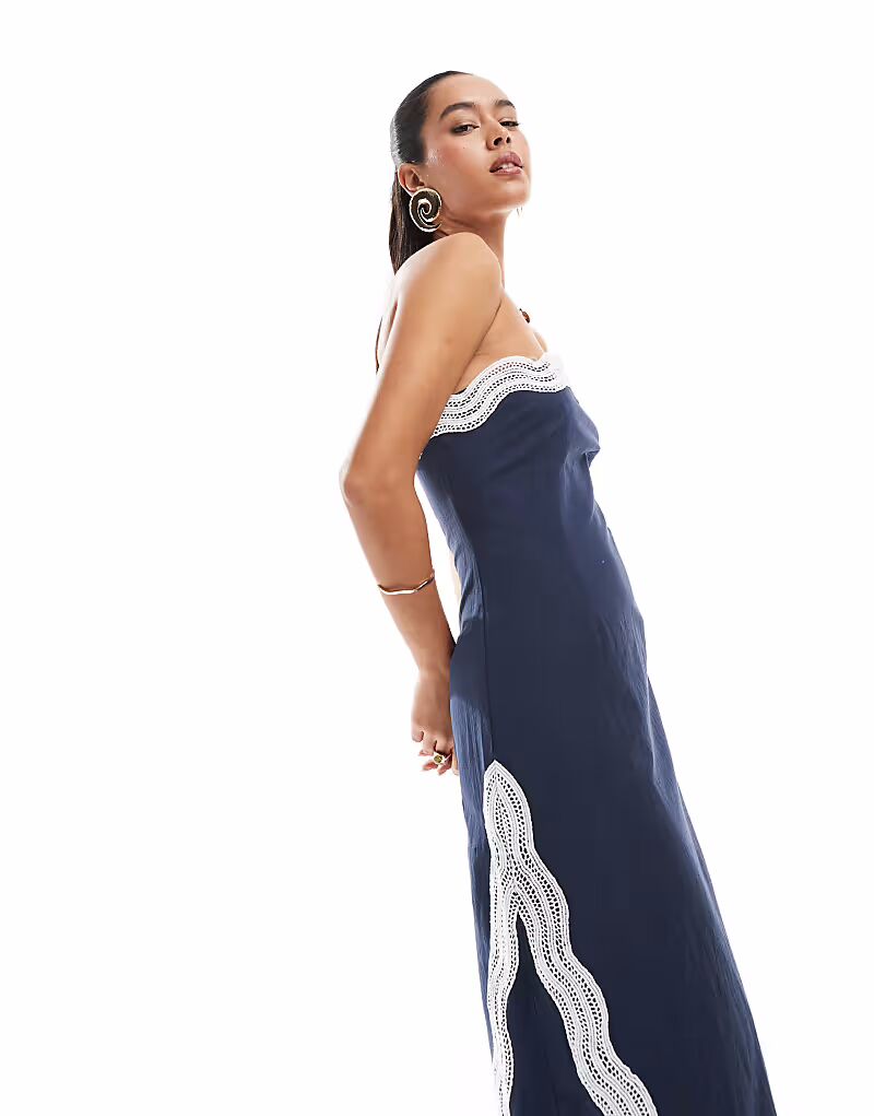 4th & Reckless льняной образ с контрастной отделкой в виде фестонов, длинное платье-бандо синего цвета