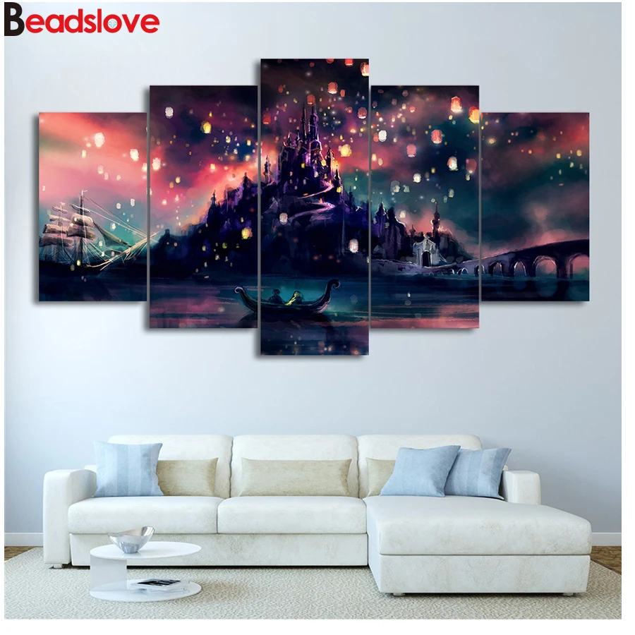 5 панелей, алмазная вышивка, спутанная принцесса, мультяшный замок, алмазная живопись, алмазная стена, искусство, мультяшная картина, детски...