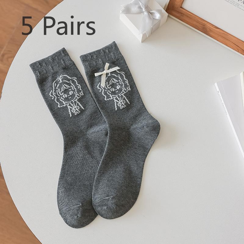 5 пар простых и универсальных носков для девочек на весну и осень с бантом, милые и модные, длиной до середины икры 5 Pairs серый