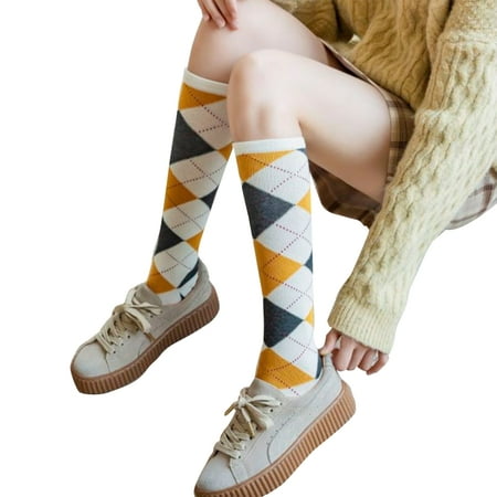 YEUHTLL Japanese Preppy Style Women Knee High Socks College Vintage Multicolor Argyle Diamond Plaid Print Uniform Cotton Mid Tube Calf Stockings