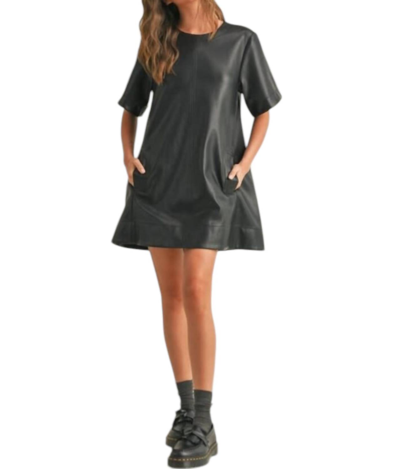 Платье из искусственной кожи с короткими рукавами и расклешенным низом черного цвета MIOU MUSE