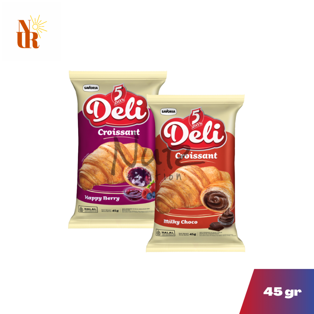 Nikmati kelembutan croissant dengan isian lezat dalam setiap gigitan 5 Days Deli Croissant. Roti bertekstur lembut dan empuk ini cocok jadi teman sarapan, camilan sore, atau bekal harian.