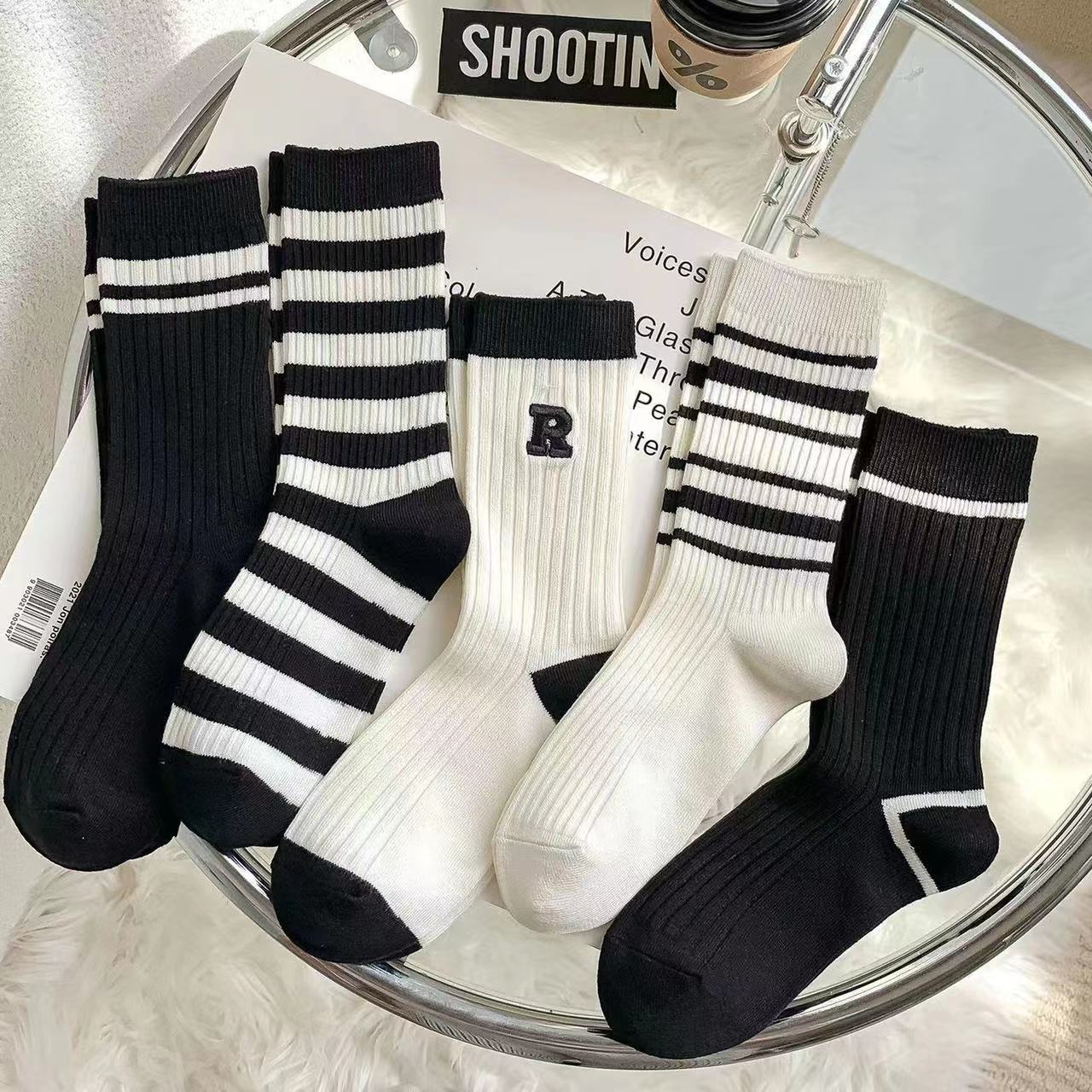 5PCS Женские носки Зимние спортивные носки Черно-белые Простые средние носки Корейские винтажные чулки Полосатые модные носки