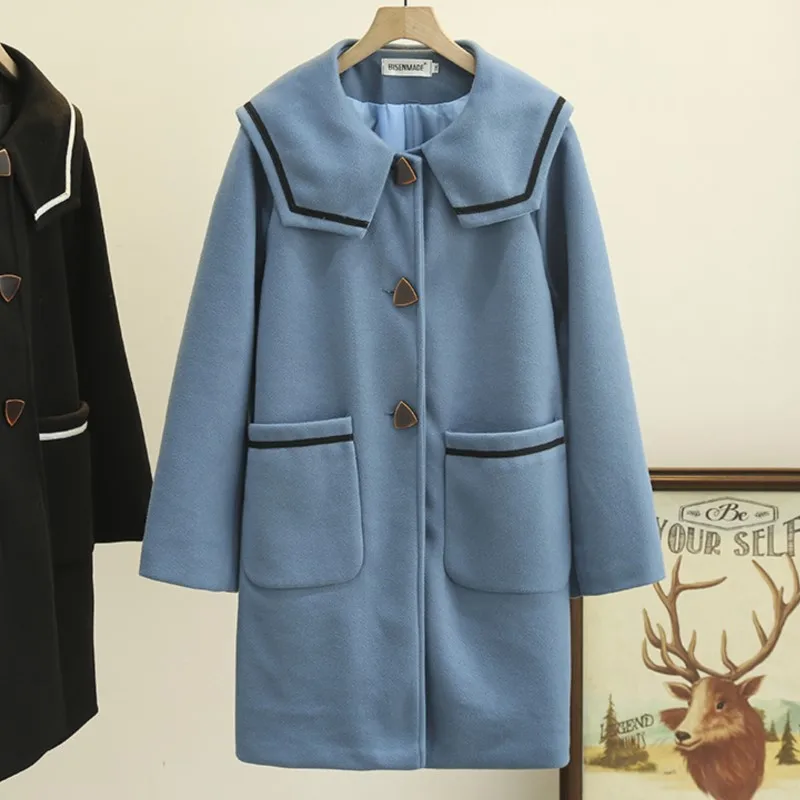 5XL Плюс Размер Женщины Шерстяная Шинель 2022 Осень Зима Темперамент Морской Воротник Длинное Пальто Мода Однобортный Теплый Outewear Кривые Одежда