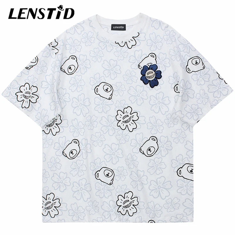Футболка LENSTID мужская с коротким рукавом, повседневная тенниска из хлопка в стиле хип-хоп, уличная одежда с цветочным принтом медведя, лето ...
