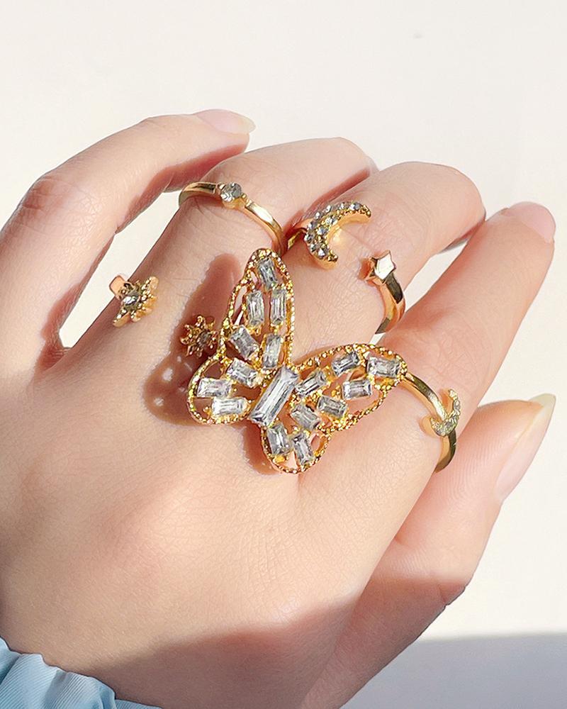 5pcs Rhinestone Moon Star Butterfly Pattern Rings Set, Gold