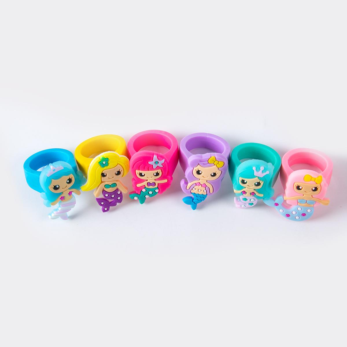 6 шт. Кольцо с русалочкой, тема русалки, украшение на первый день рождения для девочек, детские игрушки, подарок, силиконовое кольцо, кольцо с мультяшной русалкой