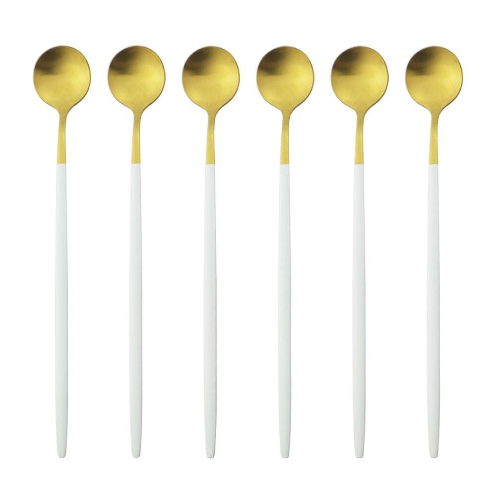 6 шт., красочные столовые приборы с длинной ручкой, матовая ложка из нержавеющей стали, полированная, перемешивающий напиток, мороженое, десерт, чайная ложка, набор посуды золотой/белый