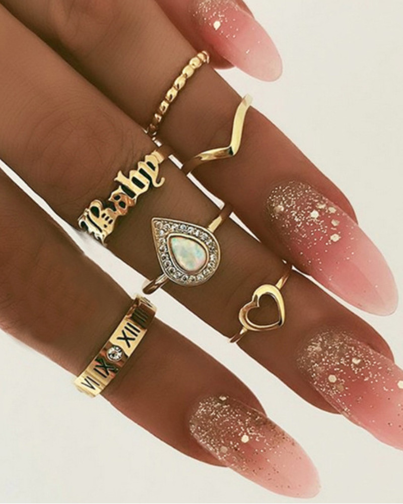 6PCS/Set Letter Heart Rhinestone Decor Ring, Gold