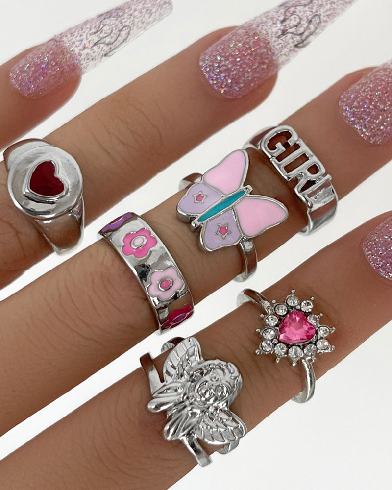 6PCS/Set Rhinestone Decor Heart Letter Butterfly Pattern Ring, Silver