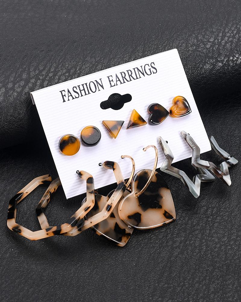 6Pair Retro Cheetah Pattern Star Heart Geometric Pattern Earrings Set, Gold