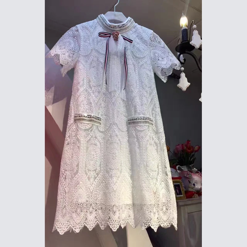 Amazon Hot Style Fashion A-Line Stand Collar Short Sleeve Lace-up Hollow Out Summer Ladies Elegant White Lace Dress From China, White,pink