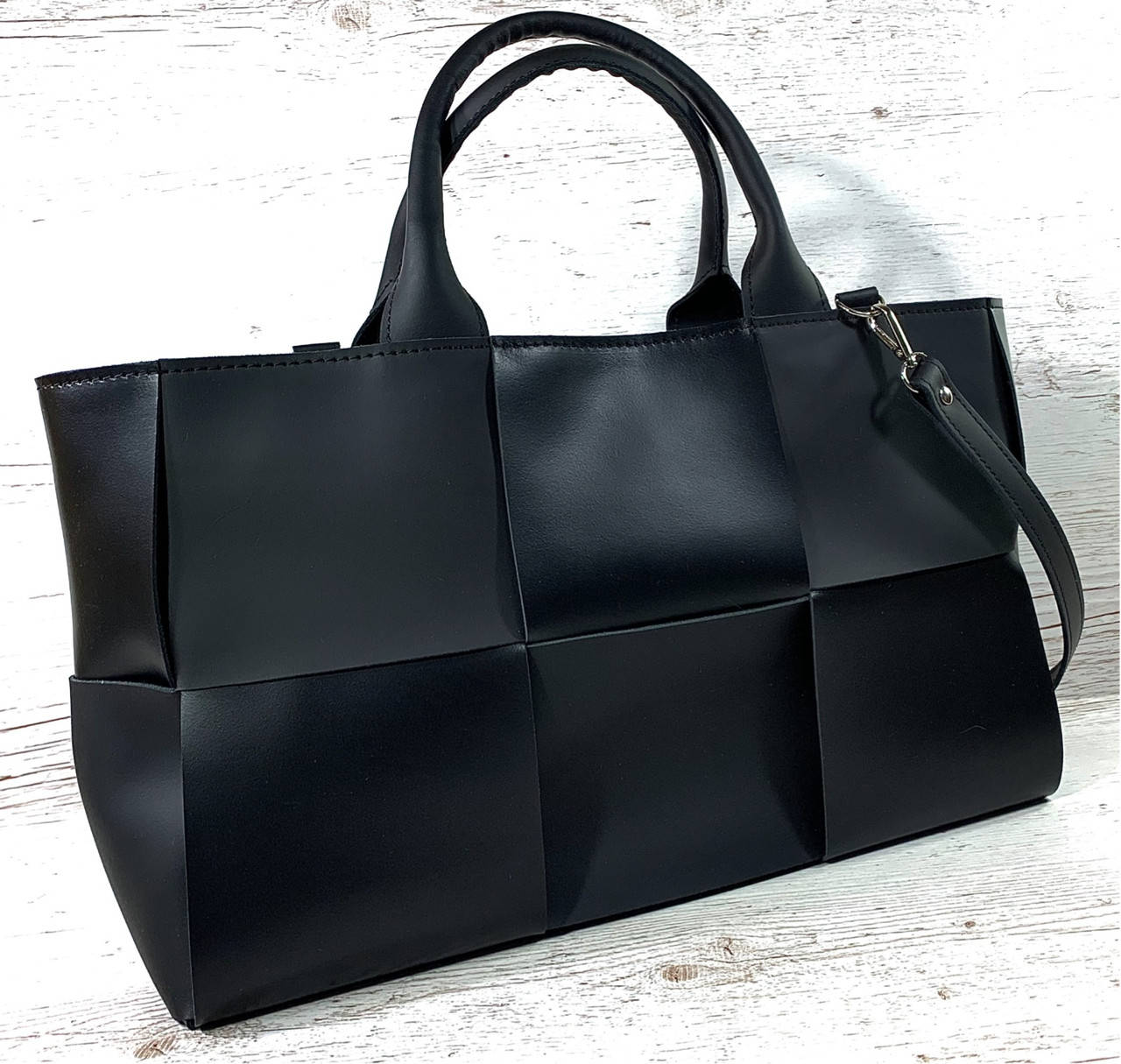 Модная и элегантная, удобная и вместительная сумка-тоут самого актуального дизайна - из переплетенных полос натуральной кожи, создающих трендовые в этом сезоне квадраты :). Форма и дизайн этой модели позволяют носить ее как с платьем или юбкой-карандаш и лодочками, так и с джинсами и кроссовками или любой другой обувью в спортивном стиле. Лаконичность и элегантность этой модели отлично впишутся как в деловой или классический образ, так и в смарт-кэжуал или стиль спорт-шик. Размер этой сумки позволит взять с собой в город всё, что нужно в пути, для работы и посещения зала или досуга- всё для насыщенной жизни в течение дня и вечером :)