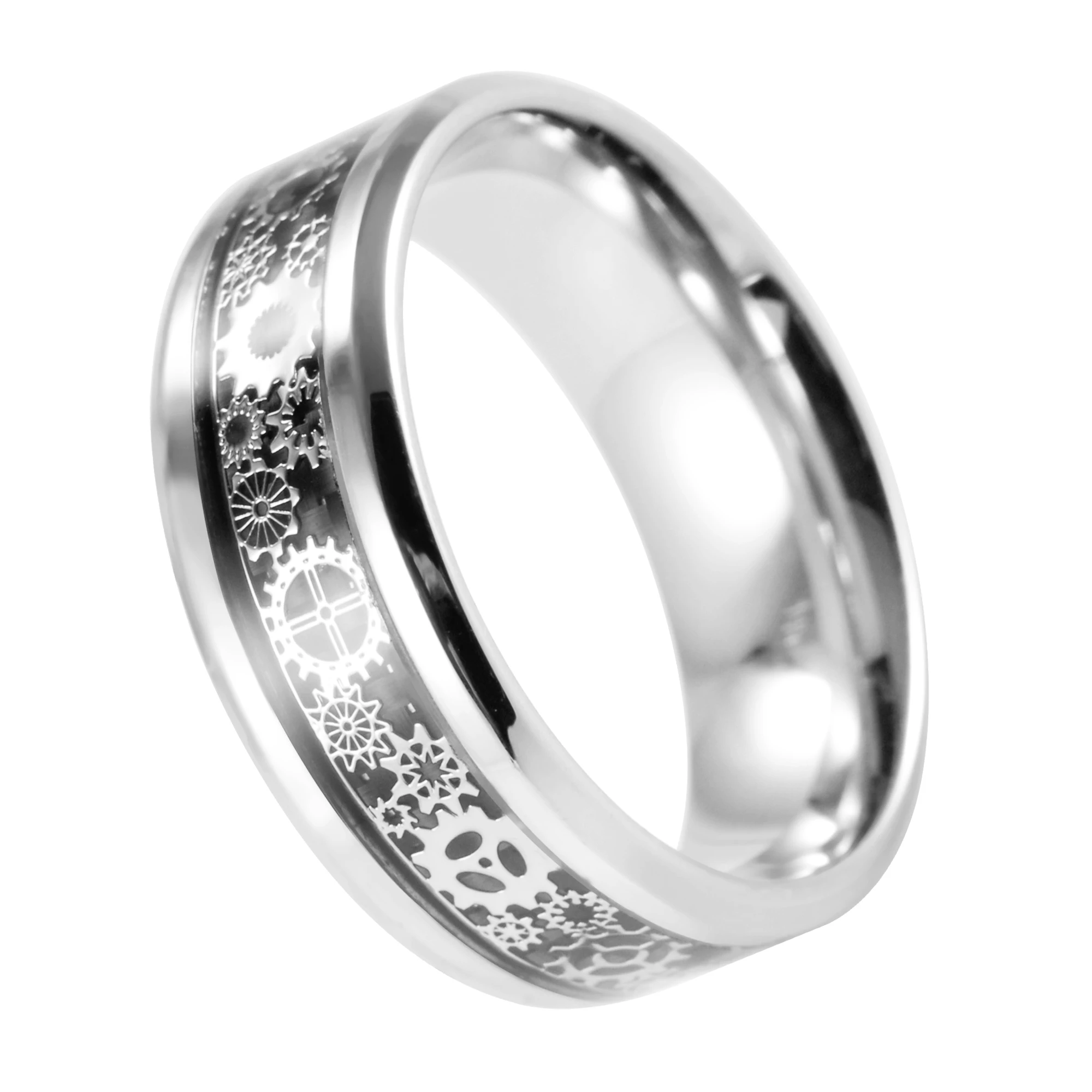 8 мм Серебряный Вольфрам кольцо с механическими кнопками Шестерни колеса черное углеродное волокно инкрустация Для Мужчин's Вольфрам обручальные кольца Для Мужчин's Юбилей кольцо