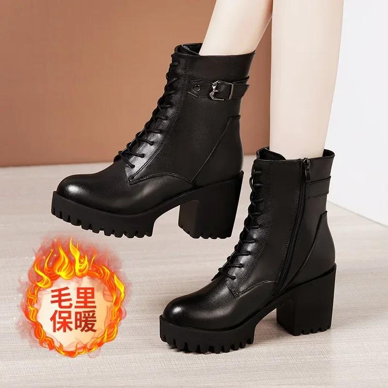 8 см Маленький размер 32-43 Качественные ботинки из натуральной кожи Женская обувь на платформе с мехом 2025 Зимние ботильоны на высоком блочном каблуке 40