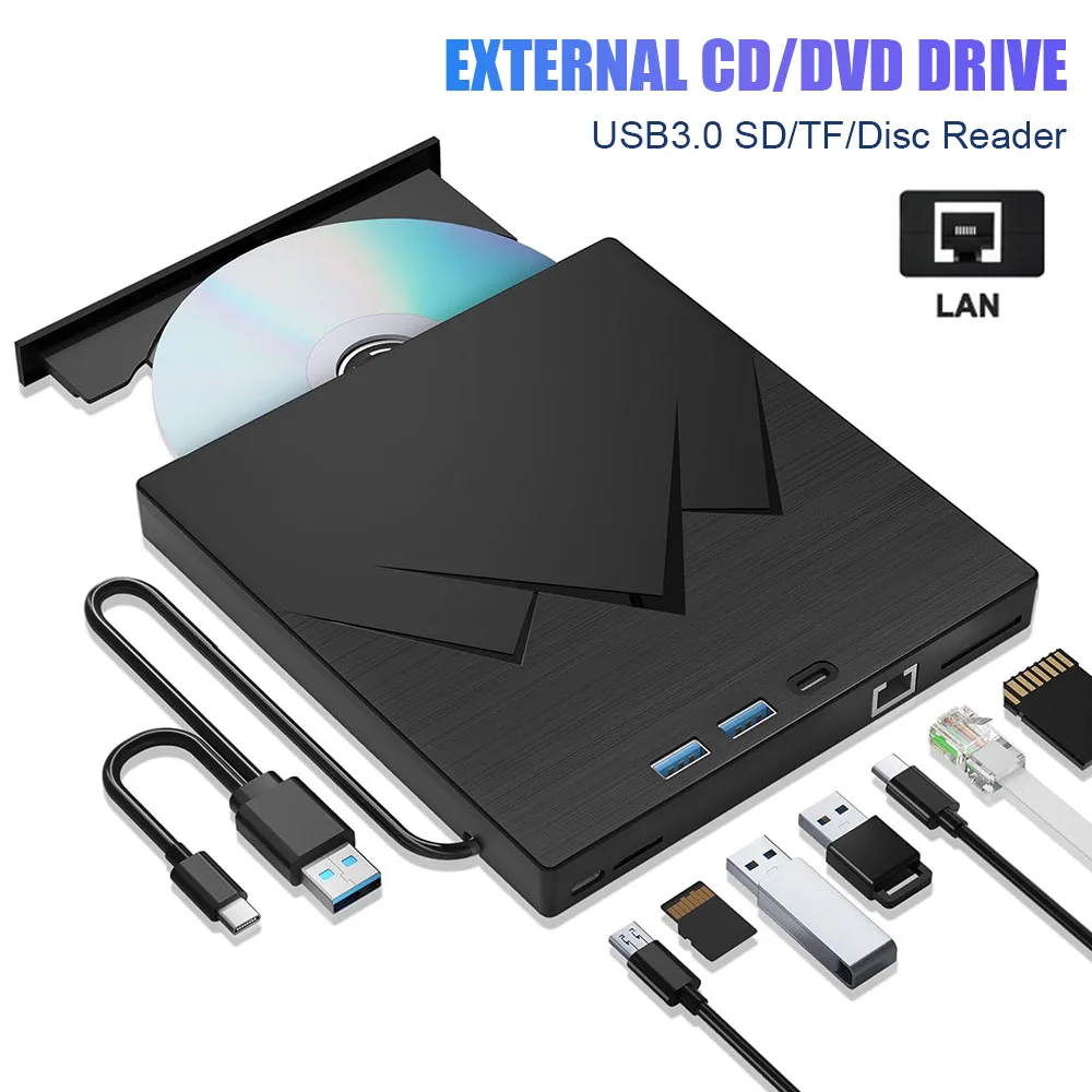 8-IN-1 External CD/DVD Drive with Ethernet Adapter,TF/SD Card Reader,USB3.0 CD/DVD Player Reader Writer for Windows Mac OS