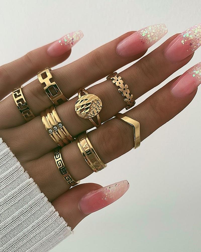 8PCS Floral Studded Rings Set, Gold
