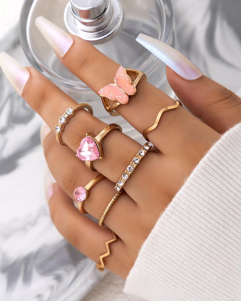 8PCS Rhinestone Butterfly Heart Decor Ring Set, Gold