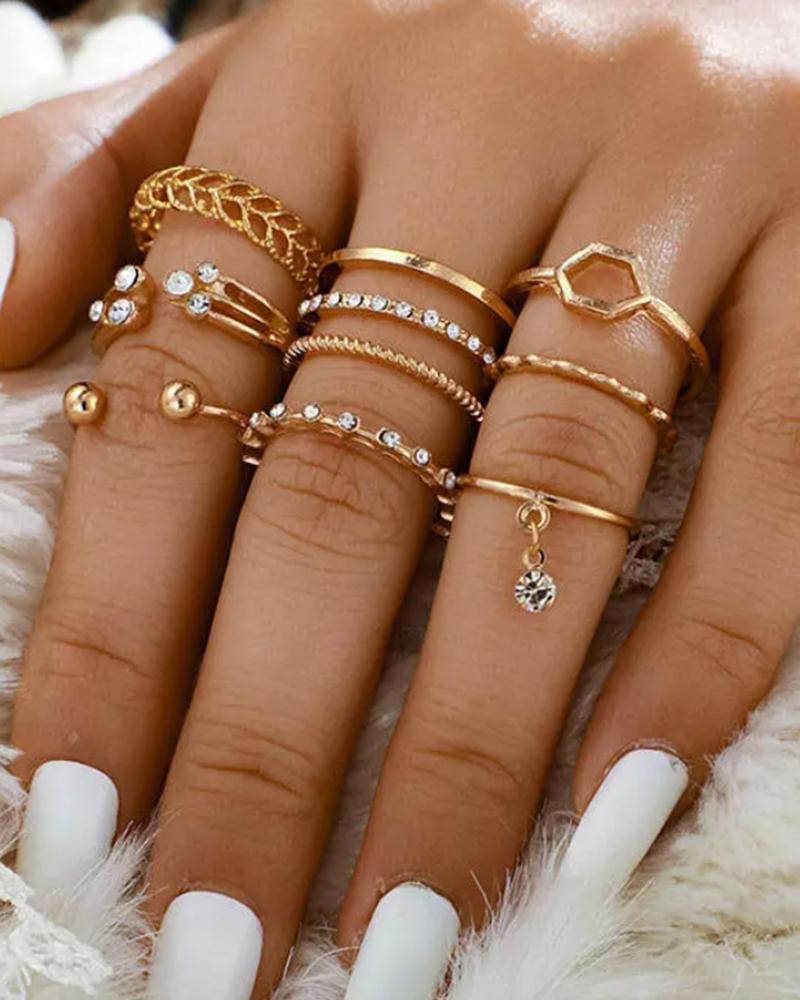 8pcs Stackable Rhinestone Hollow Out Leaf-shaped Open Rings Set, Gold