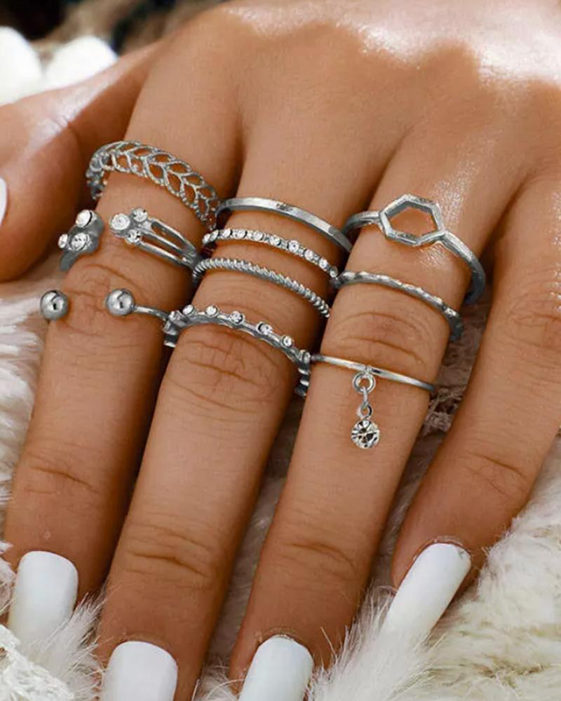 8pcs Stackable Rhinestone Hollow Out Leaf-shaped Open Rings Set, Silver