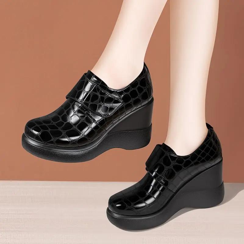 9 см Маленький размер 32-43 Туфли-лоферы из лакированной кожи с глубоким вырезом Женская обувь на платформе и танкетке 2025 Осень Туфли на высоком каблуке Офисная модель для мамы 37