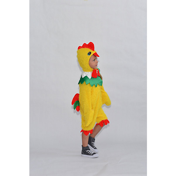 Верх 100% полиэстер; подклад: 35% хлопок+65%полиэстер Карнавальный костюм Петушок из мохнатого желтого плюша. Комбинезон с воротником ярко зеленого цвета, застегивается по спинке на молнию, рукава выполнены как крылышки. Шапка с красным хохолком, с глазками и клювом.