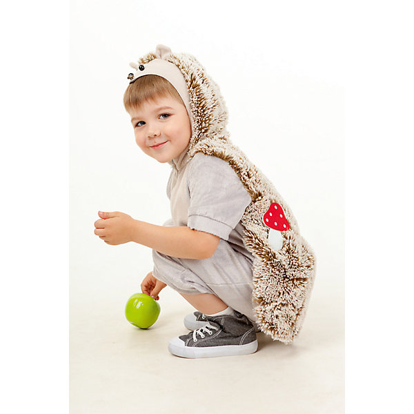 Верх 100% полиэстер; подклад: 35% хлопок+65%полиэстер Карнавальный костюм Ежик выполнен в виде комбинезона с капюшоном. На спинке плюш длиноворосовый, иммитация иголочек ежика, серого цвета, украшен аппликациями. На капюшоне пуговки в виде глазов и носика, маленькие объемные ушки. Застежка вперди на молнии.