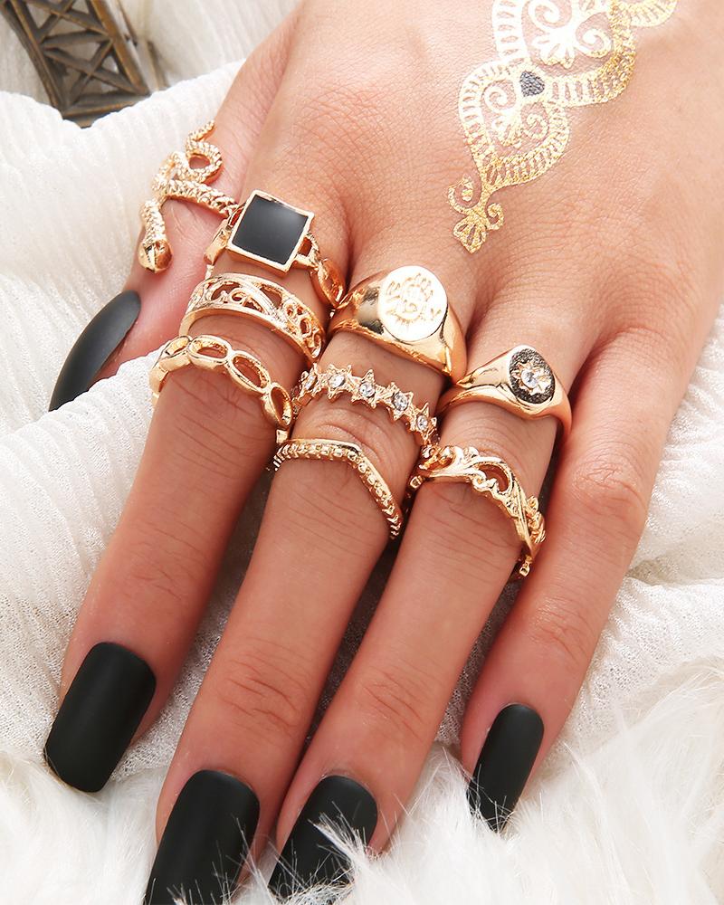 9PCS Snake & Star Pattern Studded Rings Set, Gold