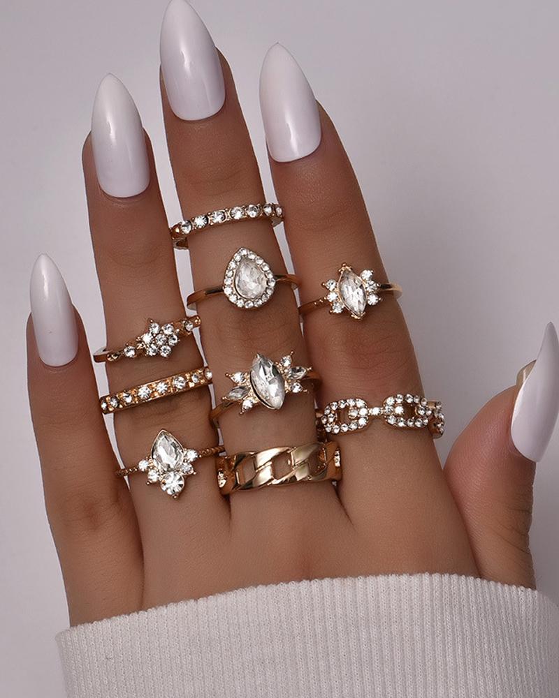 9pcs Geometric Rhinestone Waterdrop Shaped Rings Set, Gold